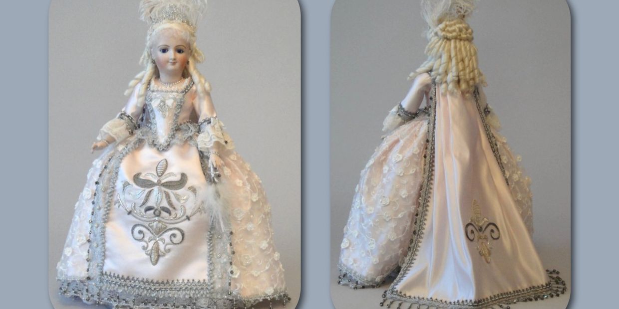 Marie Antoinette with silver thread work all done by hand, designed by artist. Artist made mohair wig.